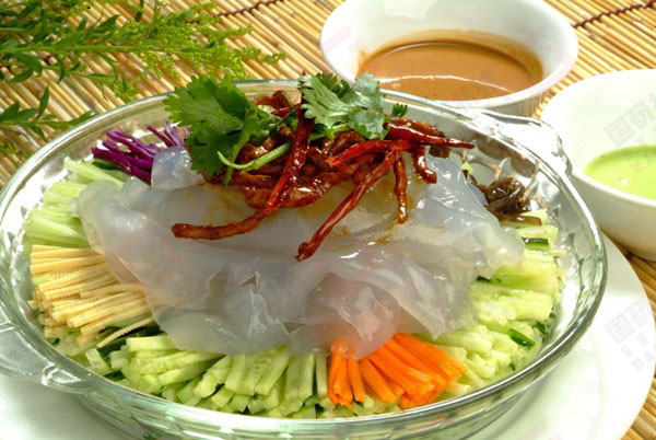 5.吃的時候?qū)⒗乃腥〕銮谐蓪挆l,放入備好的各種絲、炒好的肉絲和兌好的調(diào)料汁,再放入少許鹽拌勻就可以吃了,在飯店吃或者做宴客菜,就將所有的絲墊底,上面放拉皮,炒好的肉絲放到拉皮上,再澆上調(diào)料汁,吃的時候再拌勻就可以了