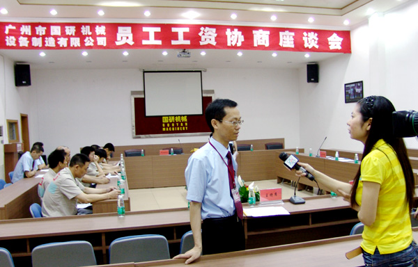 5月14日晚9:30分,中央電視臺新聞頻道“新聞1+1’ 節(jié)目以《工人工資到底怎么才能漲?》為題重點披露富士康等企業(yè)在工人工資方面存在的種種問題,同時正面報道了廣州國研機(jī)械通過建立員工工資集體協(xié)商機(jī)制解決員工工資問題的先進(jìn)經(jīng)驗。