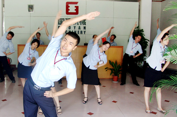 每天早上8:30,隨著公司團(tuán)支部書記李運喜一聲哨響,健身活動正式開始!全體員工迅速集合,不到兩分鐘,就在健身場地排起了整齊的隊伍,一個個精神抖擻、神采奕奕。體育專業(yè)出身的團(tuán)員青年朱承容,站到隊伍前列給大家當(dāng)教練。公司高管帶頭參與,大家整齊劃一練起來?!暗谝还?jié),頭部運動,一二三四五六七八…… “教練”認(rèn)真,“學(xué)員”用心,整個健身場面生動、氣氛活潑、積極向上。