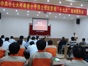 2007年11月14日下午3時,中共十七大代表唐小平博士前來我司宣講十七大精神,活動在廣州市國研機械設(shè)備制造有限公司大會議廳舉行,參加大會的有廣州市天河區(qū)組織部、宣傳部領(lǐng)導、珠吉街道黨工委的領(lǐng)導同志們以及我司全體員工,廣東電視臺、廣州日報等多家媒體派記者前來報道。大會由國研副總經(jīng)理、黨支部書記王聲躍主持, 國研董事長、總經(jīng)理王聲位作了熱情洋溢的講話,介紹了國研機械的發(fā)展規(guī)劃以及黨支部的建設(shè)情況。