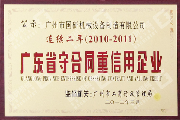 2012年3月,廣州市國(guó)研機(jī)械設(shè)備制造有限公司被評(píng)為2011年度“廣東省守合同重信用企業(yè)”。這是我司繼連續(xù)三年被評(píng)為“廣州市守合同重信用企業(yè)”之后,連續(xù)兩年獲此殊榮。